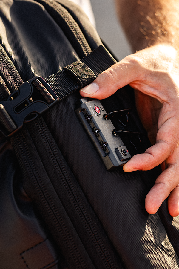 The backpack has a TSA-approved lock with metal zipper stoppers and a combination code.