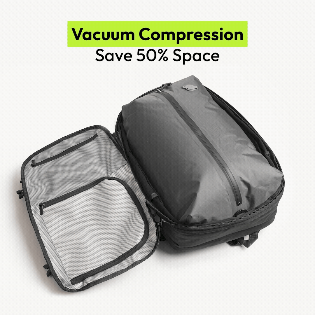 You can extract the air using a regular vacuum or our compact carry-on vacuum pump. The vacuum pump is specifically designed for convenience, allowing you to compress your backpack effortlessly while on the go. This way, you can take full advantage of the backpack’s functionality, no matter where your adventures take you!